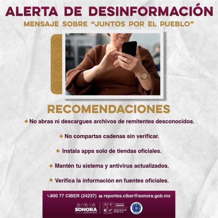 Hermosillo, Sonora; 22 de septiembre de 2025.- La Unidad Cibernética del Gobierno de Sonora advirtió a la ciudadanía sobre un mensaje falso que circula en redes sociales como WhatsApp, en el que se invita a descargar un archivo denominado “Juntos por el Pueblo” que, supuestamente, “hackea” el teléfono en 10 segundos.