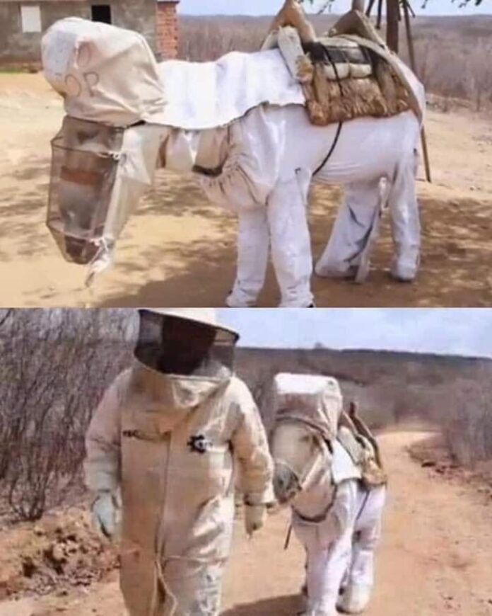 Apicultor protege a su fiel burrito Boneco durante la recolección de miel, tras 15 años de trabajo juntos; esto es amor a tus semejantes.