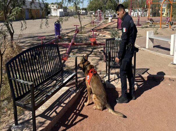 Con el trabajo operativo de la División Canina K-9 de la PESP, se logró el hallazgo de 11 envoltorios con narcótico durante un operativo en espacios públicos en la colonia Villa del Prado, donde el ejemplar canino Zeusz, especialista en detección de narcóticos, armas de fuego y divisas, alertó sobre la sustancia prohibida.