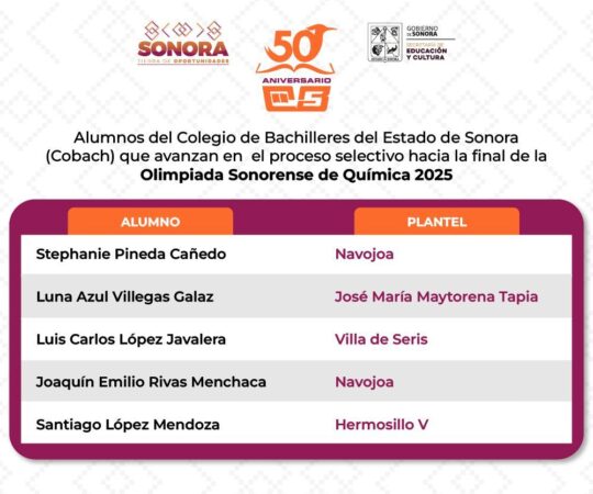 Stephanie Pineda Cañedo y Joaquín Emilio Rivas Menchaca (plantel Navojoa), Luna Azul Villegas Galaz (plantel José María Maytorena Tapia de Guaymas), Luis Carlos López Javalera (plantel Villa de Seris) y Santiago López Mendoza (plantel Hermosillo 5) avanzaron en el proceso selectivo para integrar la delegación sonorense que asistirá a la Olimpiada Nacional de Química 2025.