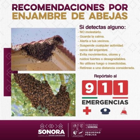 Hermosillo, Sonora; 24 de septiembre de 2025.– Con el objetivo de prevenir riesgos a la población ante la presencia de enjambres de abejas, el Gobierno de Sonora exhortó a la ciudadanía a reportar de inmediato su ubicación exacta en la línea de emergencia 9-1-1.