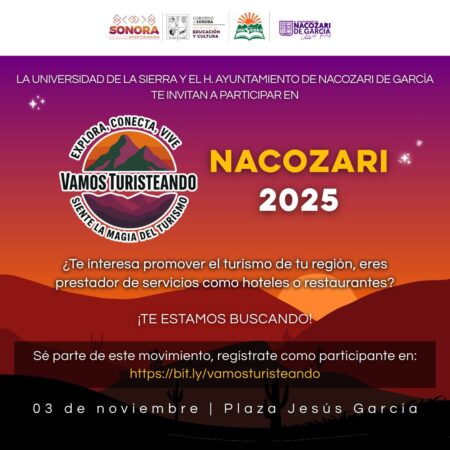 La actividad se llevará a cabo el lunes 3 de noviembre en la Plaza Jesús García de Nacozari y las personas interesadas pueden consultar las bases en: https://bit.ly/vamosturisteando y registrarse como participante en: https://bit.ly/vamosturisteando2025.