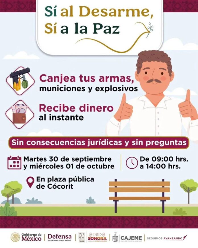 El módulo de recepción estará instalado los días martes 30 de septiembre y miércoles 1 de octubre, en la plaza pública de Cócorit, en un horario de 09:00 a 14:00 horas, donde se podrán entregar armas de fuego, municiones y explosivos de manera anónima, recibiendo a cambio dinero en efectivo, sin consecuencias jurídicas y sin preguntas.