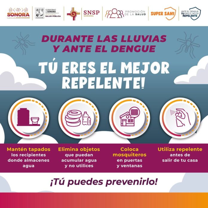 Hermosillo, Sonora; 23 de junio de 2025.- Ante la llegada de la temporada de lluvias y el incremento en la presencia del mosquito transmisor del dengue, el Gobierno de Sonora, a través de la Secretaría de Salud (SSP), hizo un llamado a la población a implementar medidas preventivas que ayuden a evitar la proliferación de criaderos y proteger la salud de las familias sonorenses.